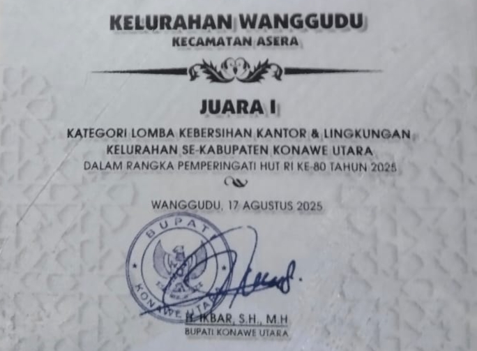 Dronesultra.co.id | Konut – Semangat kebersamaan dan kepedulian terhadap lingkungan yang ditunjukkan masyarakat Kelurahan Wanggudu membuahkan hasil manis. Dalam lomba kebersihan tingkat Kabupaten Konawe Utara yang digelar dalam rangka memperingati HUT ke-80 Republik Indonesia, Kelurahan Wanggudu dinobatkan sebagai juara pertama.